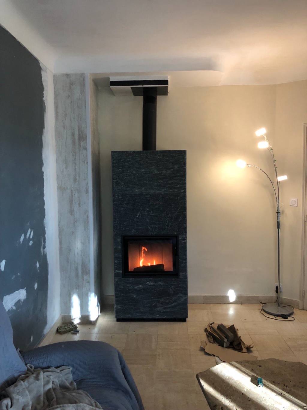 - Pose du poêle Tulikivi : Installation sur un socle stable, avec respect des distances de sécurité et des règles d’aération.