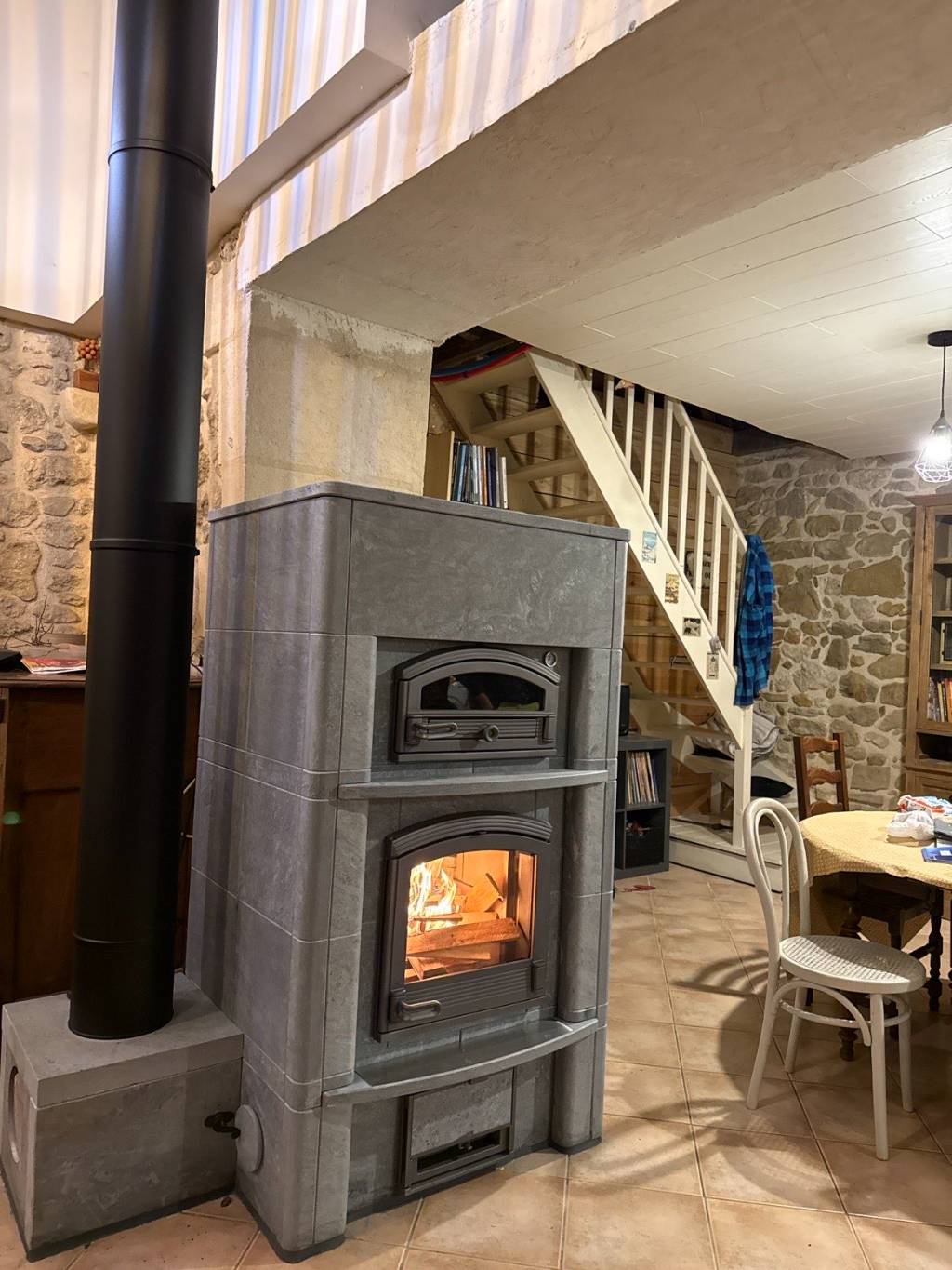 À Montprinblanc, ce projet de rénovation énergétique visait à allier performance thermique, autonomie et polyvalence. Le choix s’est porté sur le Tulikivi TLU 2000/91, un poêle de masse en pierre ollaire doté d’un four de cuisson intégré, pour répondre aux besoins de chauffage et de cuisson écologique, tout en apportant une touche d’authenticité et de durabilité à l’habitation.