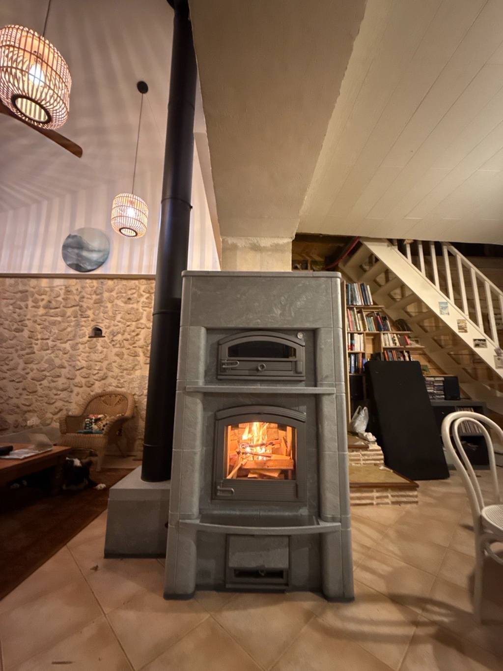 - Chaleur rayonnante et homogène : Contrairement aux poêles métalliques, tout le corps du poêle, y compris la chambre de combustion et le four, est en pierre, garantissant une diffusion douce et uniforme de la chaleur.